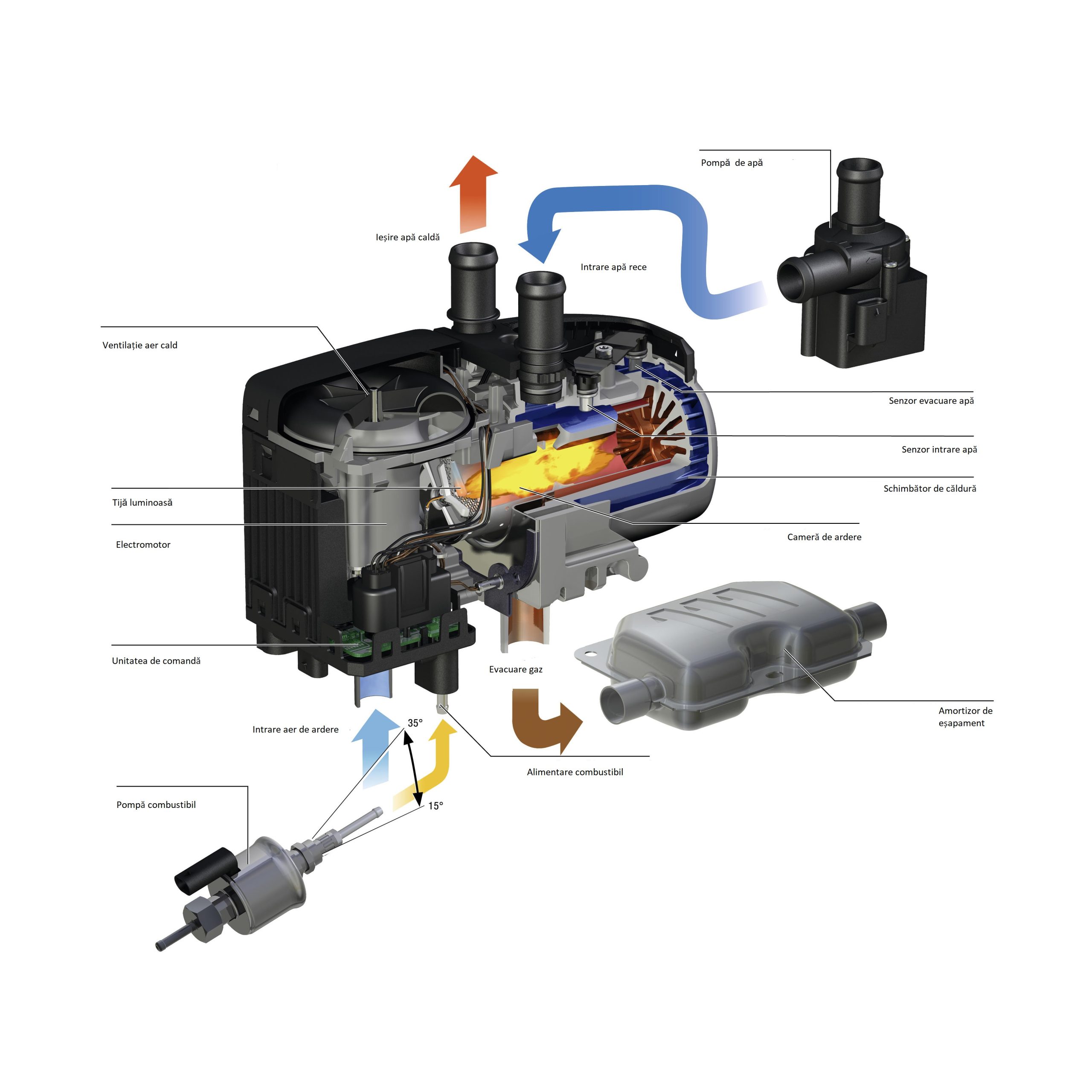 • Poate fi folosit ca încălzitor suplimentar pentru: zona frontală, preîncălzirea motorului, încălzirea interiorului prin convectoare.